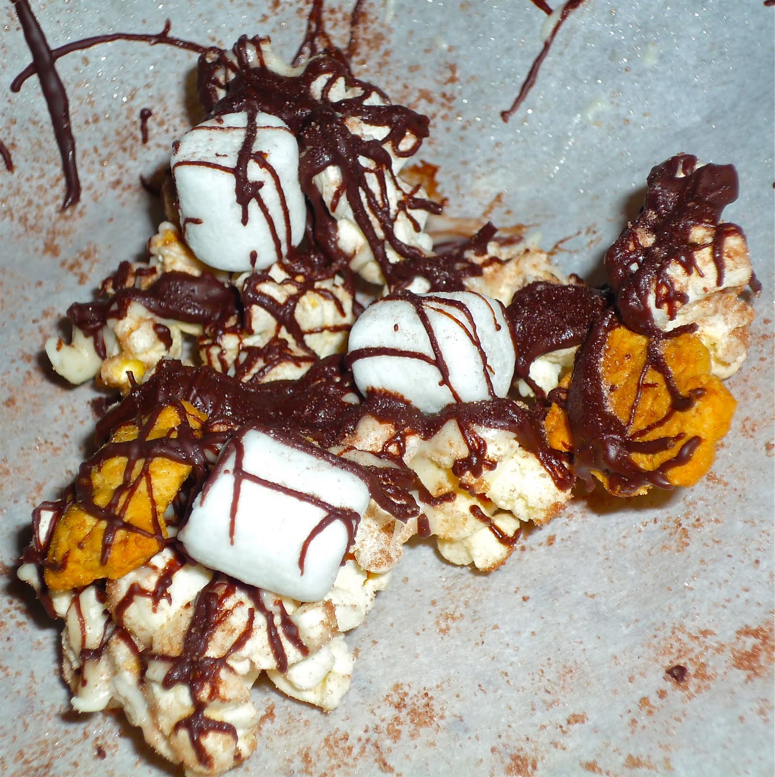 Each piece should have a bit of each flavor: chocolate, marshmallow, and crunch graham...all resting on a base of fluffy chocolate-marshmallow flavored popcorn! Look how pretty this looks...don't you just want to grab this piece and eat it?!?!?