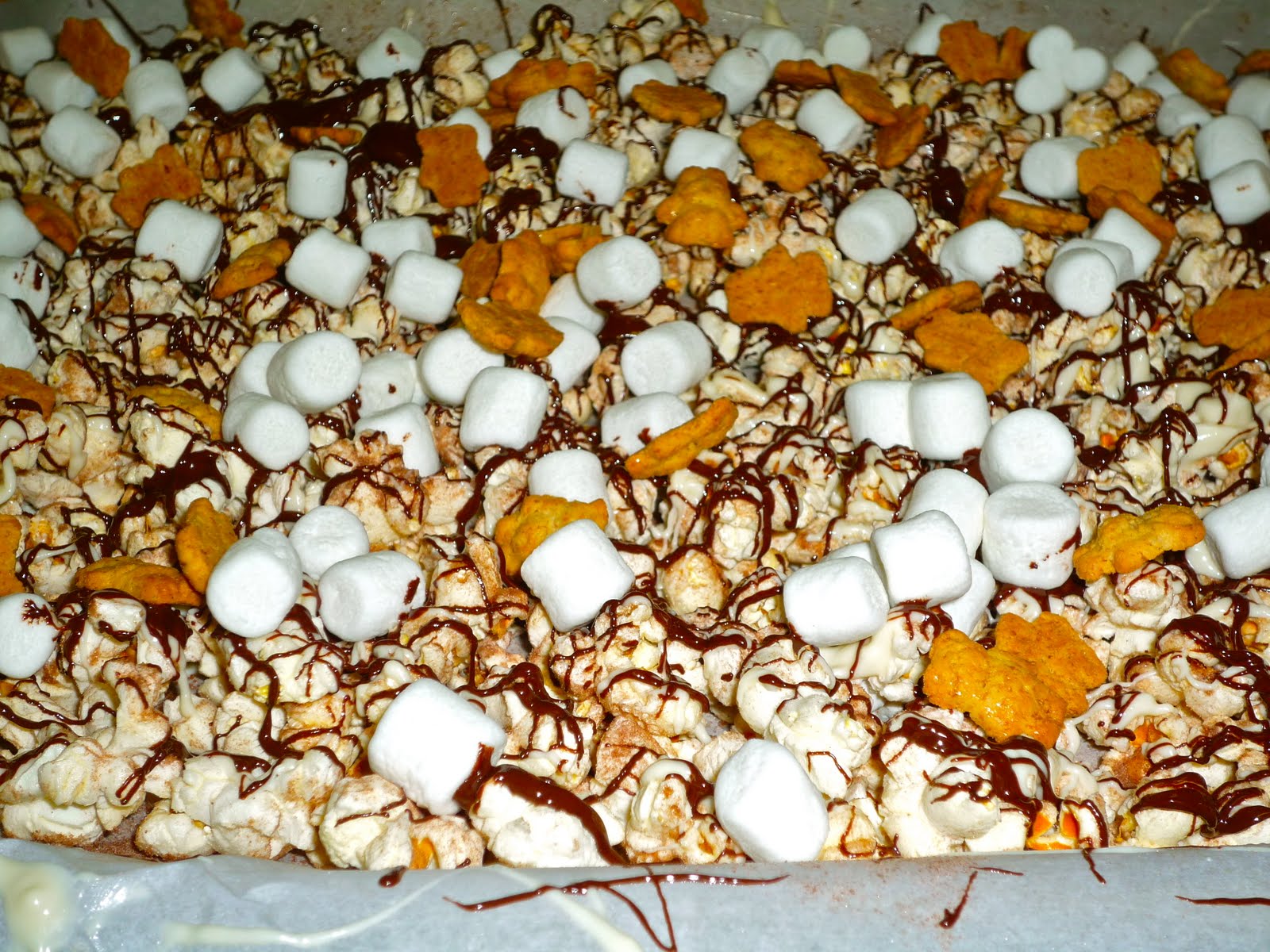 Step 4: Evenly sprinkle 1 cup miniature marshmallows and 1 cup mini Teddy Graham crackers on top of the popcorn base. Drizzle the remaining half of the semi-sweet chocolate on top of the entire pan. Place the pan in the fridge for about 15 minutes to set the chocolate, then break into bite-size pieces.