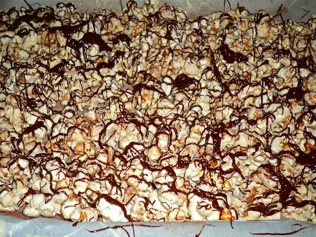 Step 3: Melt 1/2 cup white chocolate chips and 1/2 cup semi-sweet chocolate chips in two small bowls. I melted the chips in the microwave in 30-second intervals, stirring between to ensure they don't scorch. Drizzle the white chocolate over the popcorn, then drizzle half of the semi-sweet chocolate on top of the popcorn.