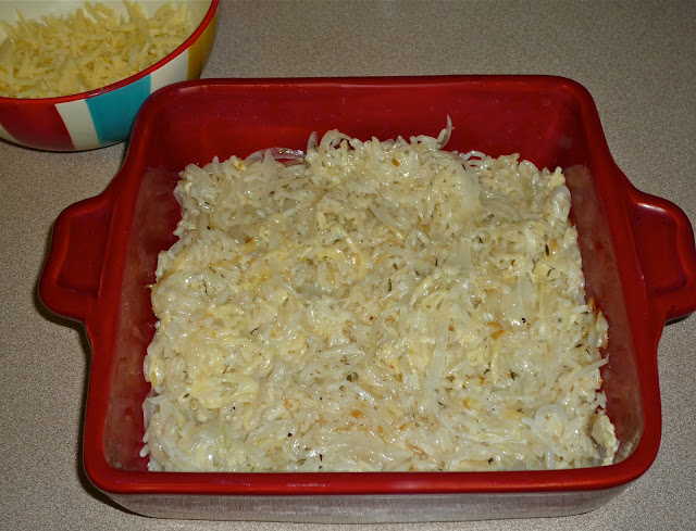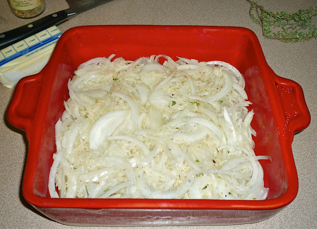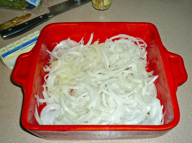 Step 1: Preheat oven to 300. Bring a pot of salted water to boil and add 1/3 cup rice; cook for exactly 5 minutes. Drain the rice and set aside. Meanwhile, thinly slice 1 lb. yellow onion. For me, this was one large yellow onion...which I sliced using my OXO hand-held mandoline. Add 2 tbs. melted butter to the onions and toss to coat. Place in a 9x9 baker.