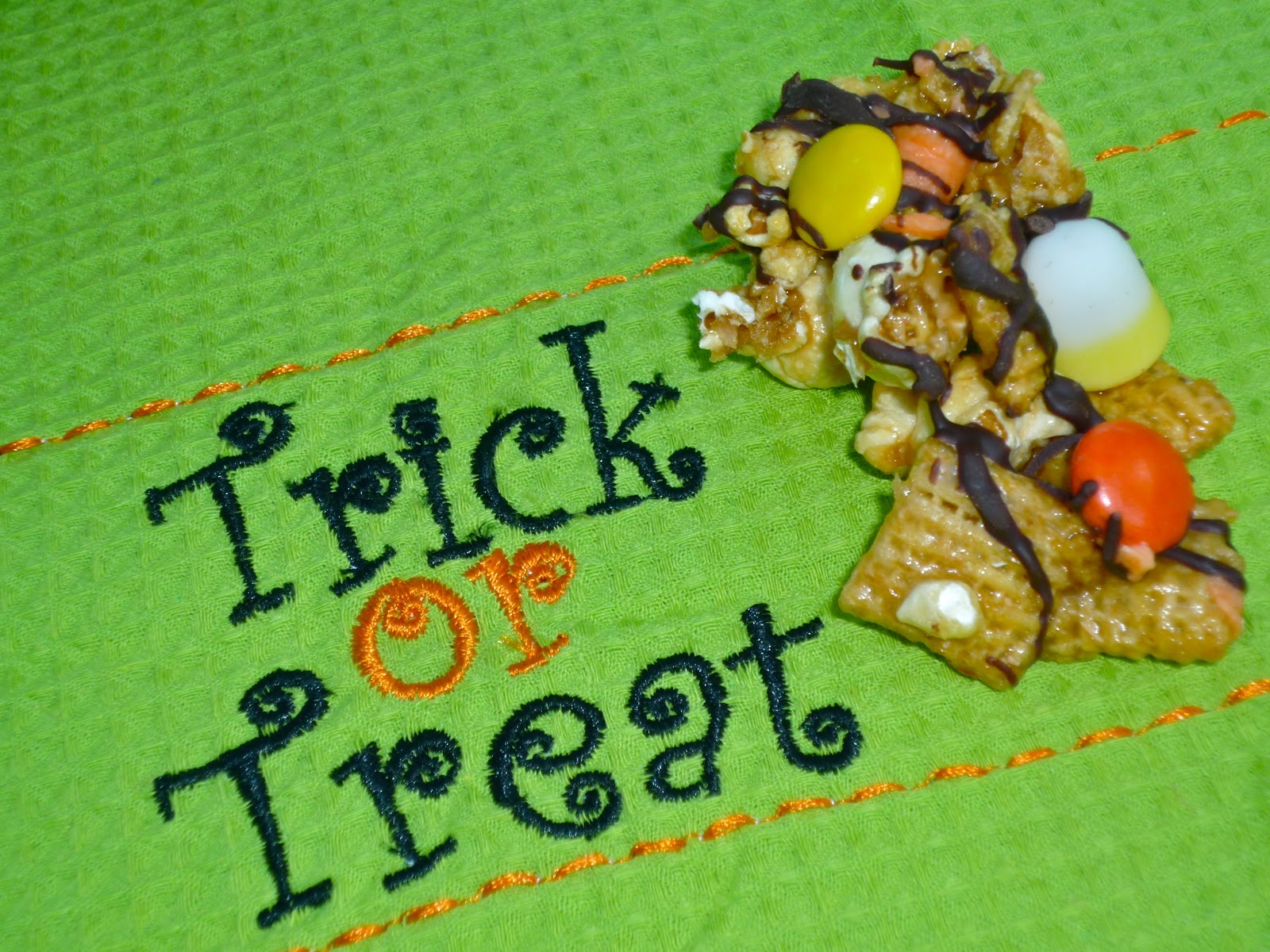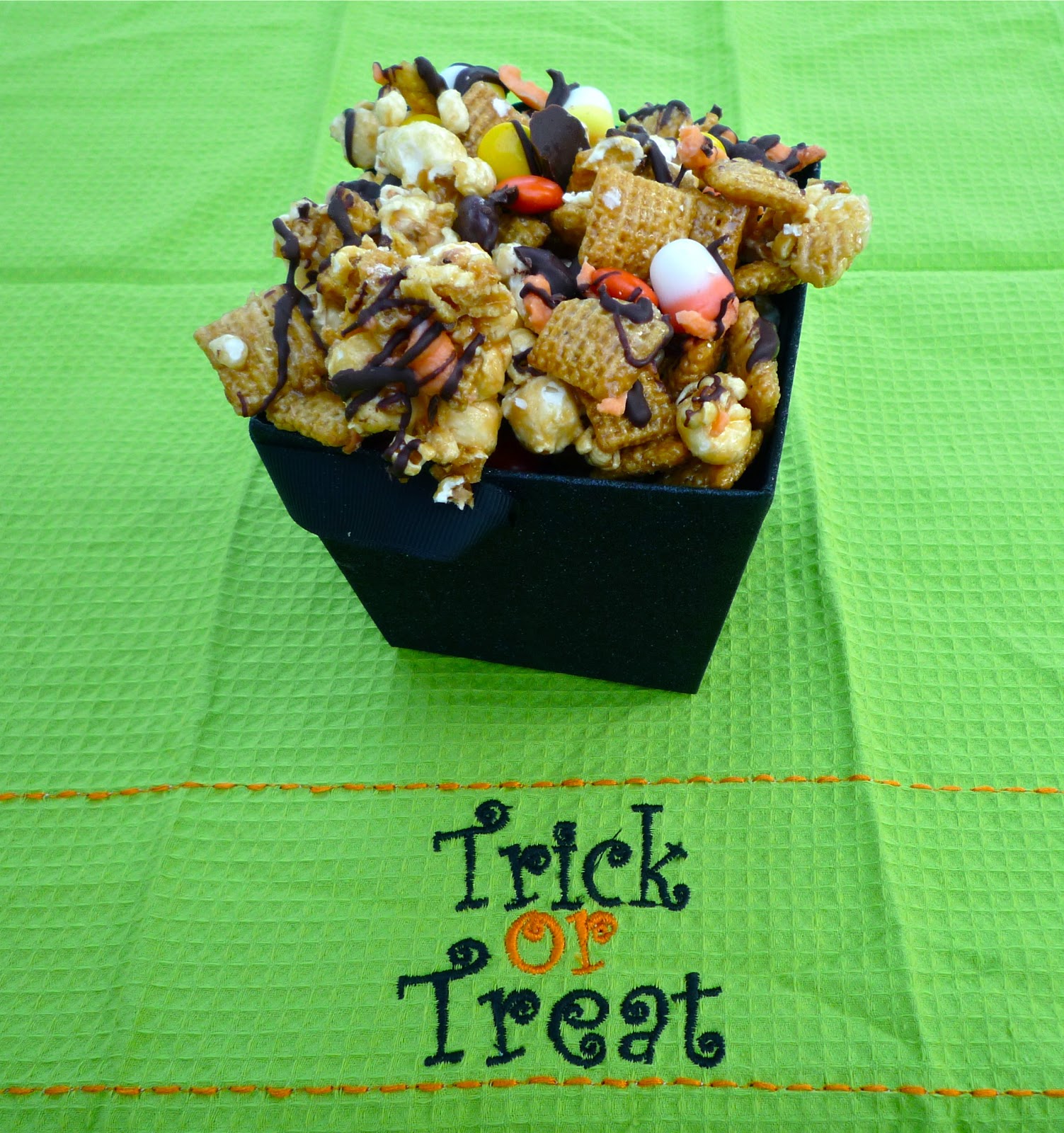 I really like mixes like this, because they're yummy and so versatile. Sub in your favorite Halloween-colored candy...this time, I opted to add Reese's Pieces and jujube candy corn, along with a drizzle of orange-tinted white chocolate and dark chocolate. The main thing is to have fun and let your imagination run wild. Easy to make, yummy to eat, and colorful? That's a winning trifecta to me, people!