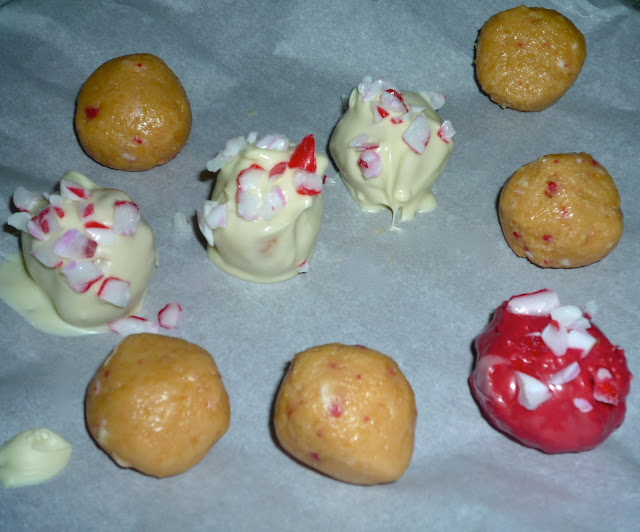 Step 2: Roll mixture into small balls. Place on a pan that's been lined with parchment paper -- you should get about 2 dozen truffles. Place the pan in the fridge or freezer to chill for about 30 minutes. When you're ready to dip, melt 4 ounces white chocolate and a package of red candy melts in small bowls. Using a skewer, dip each truffle into the chocolate. Sprinkle some crushes peppermint candies on top, before the chocolate sets.