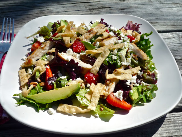 Step 2: Add the following ingredients to a large bowl: one bag of baby field greens, 6-8 quartered strawberries, and 1/4 cup thin slivers of red onion. Add the dressing and toss well to combine. Divide the greens between 2 or 3 plates. Top each salad with the following ingredients: sliced chicken breast (you can pan sear or just buy roasted deli chicken), sliced avocado, pecan pieces, feta cheese, and crispy wonton strips.
